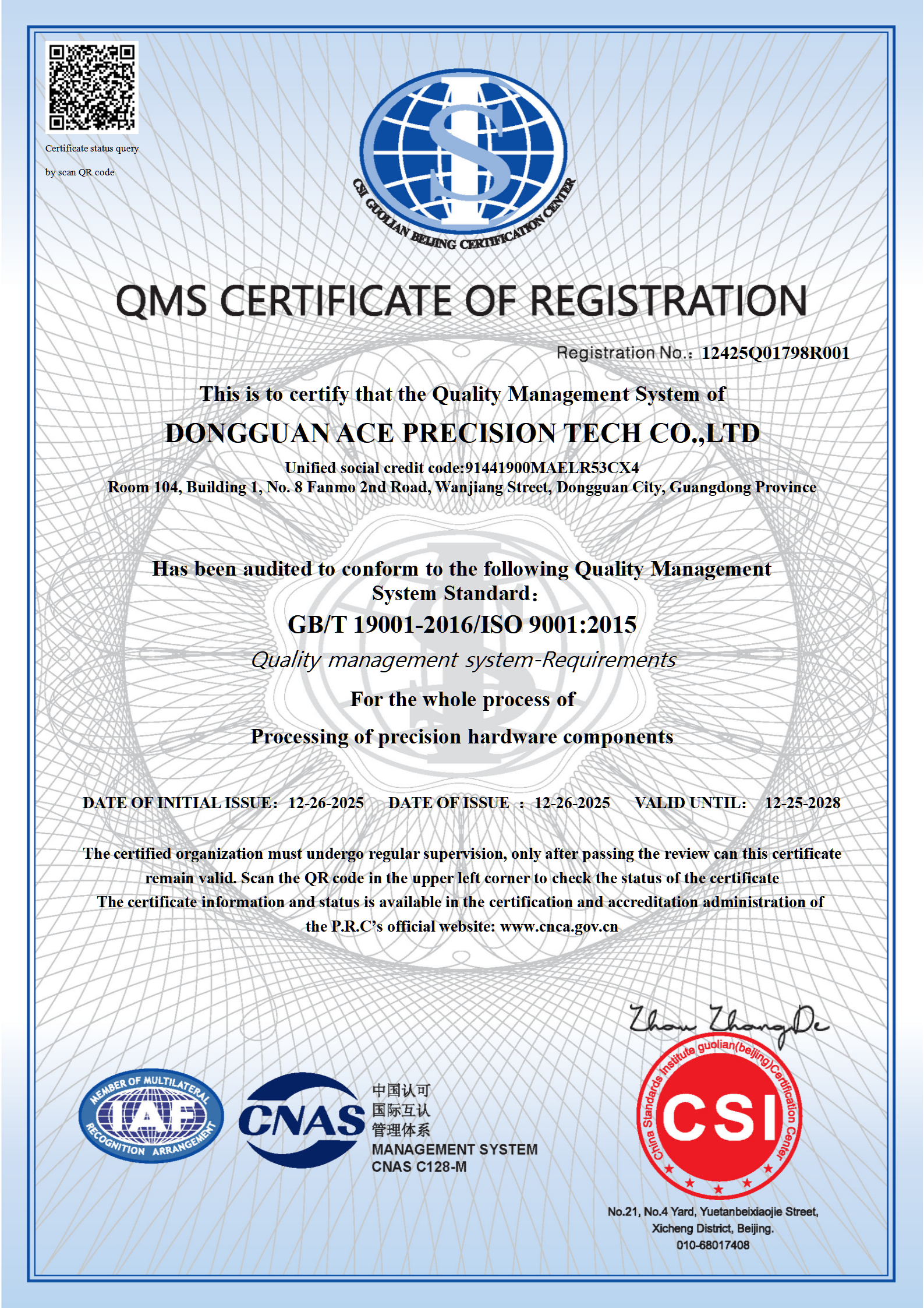 Below is our company's Quality Management System certification.